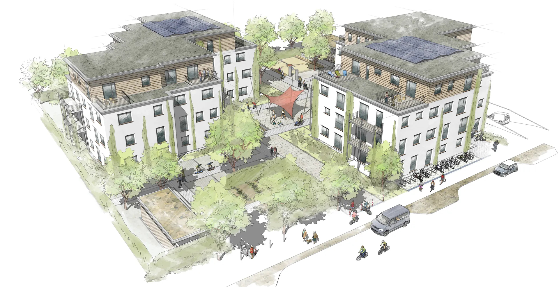 • Der Innenhof, als gemeinschaftlich-nachbarschafts-öffentliche Fläche, ist eingerahmt von den privaten grünen Wohnzimmern der Erdgeschosswohnungen und von den Eingangsbereichen